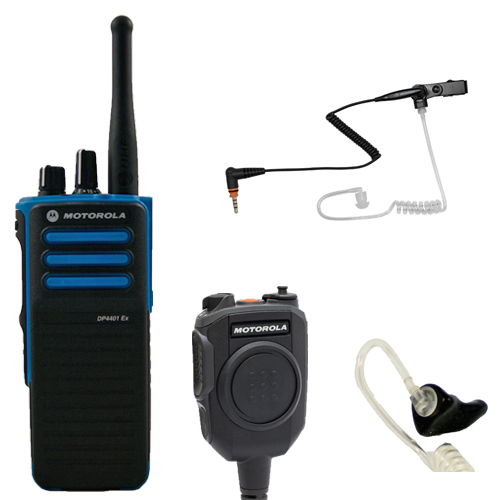 Explosieveilige Motorola DP4401Ex met Motorola PMMN4094 Active Noise Cancelling (ANC) Remote Speaker Microphone (RSM) en PMLN7188 Flextube oortje met 3.5 mm jack plug en op maat gemaakt MEP-2G otoplastieken. Deze ATEX oplossing is ontwikkeld voor operators die werken in de (petro)chemischie of in omgevingen waar kans is op een stofexplosie én waar bovendien veel lawaai is.