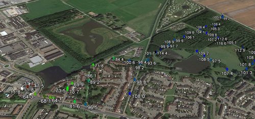 Na de veldsterktemeting krijgt u inzicht op welke locaties er sprake is van slechte of geen ontvangst, en welke voorzieningen kunnen worden getroffen. Met behulp van GPS-tracking kunnen we deze informatie in een rapport ook grafisch weergeven op uw terrein of locatie, zoals te zien is in het onderstaande voorbeeld.